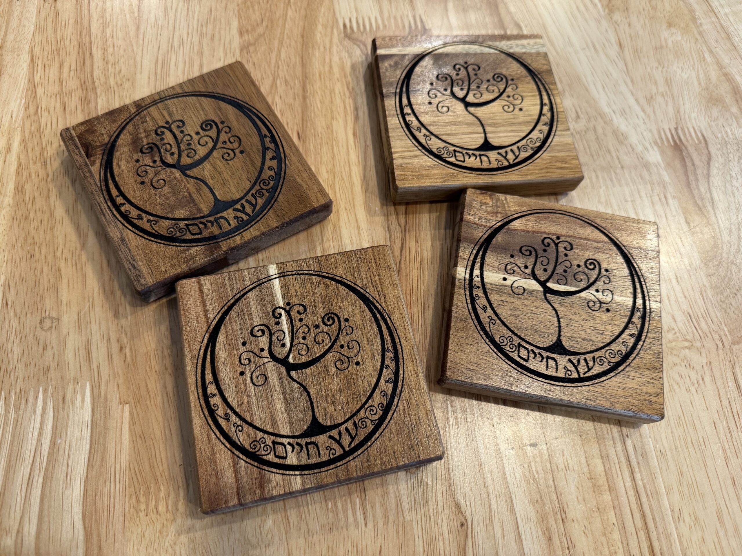 This is a set of four coasters made from acacia wood and engraved with our Etz Chaim design. Etz Chaim means 'tree of life', and refers to the Torah as a tree of life to those who hold to her (Proverbs 3:18). These coasters are sealed with an exterior polyurethane, and they have cork bottoms.