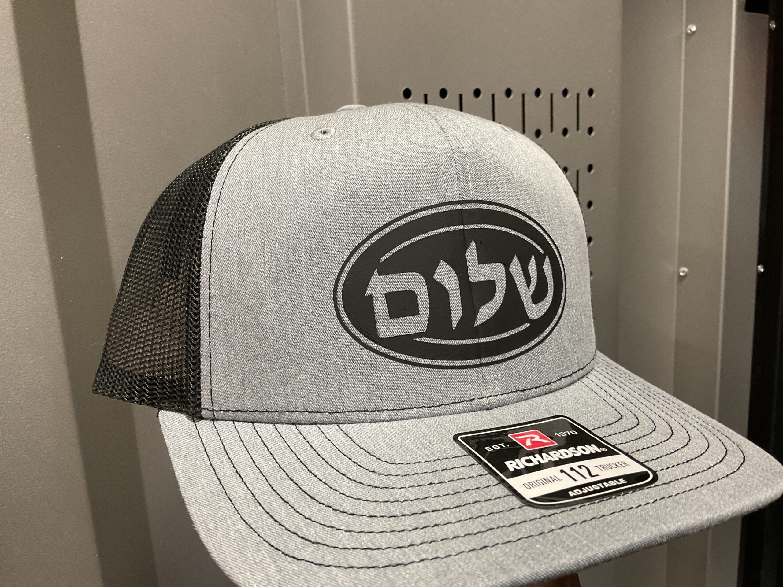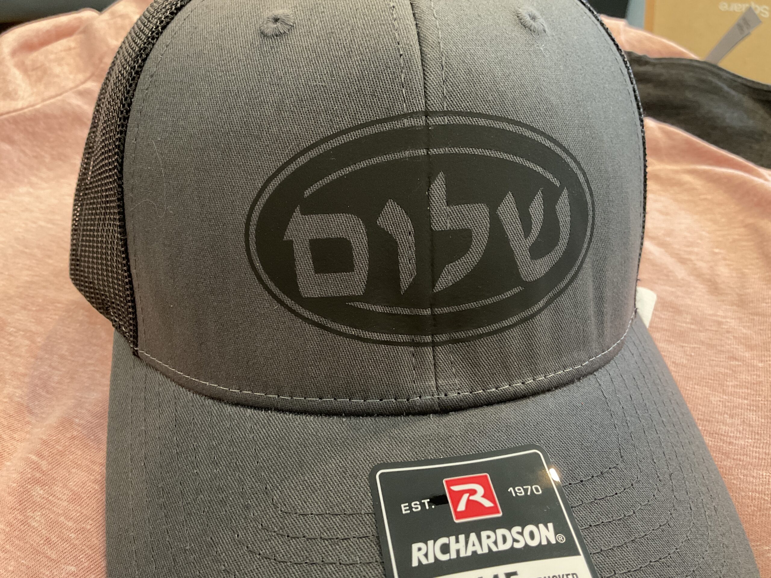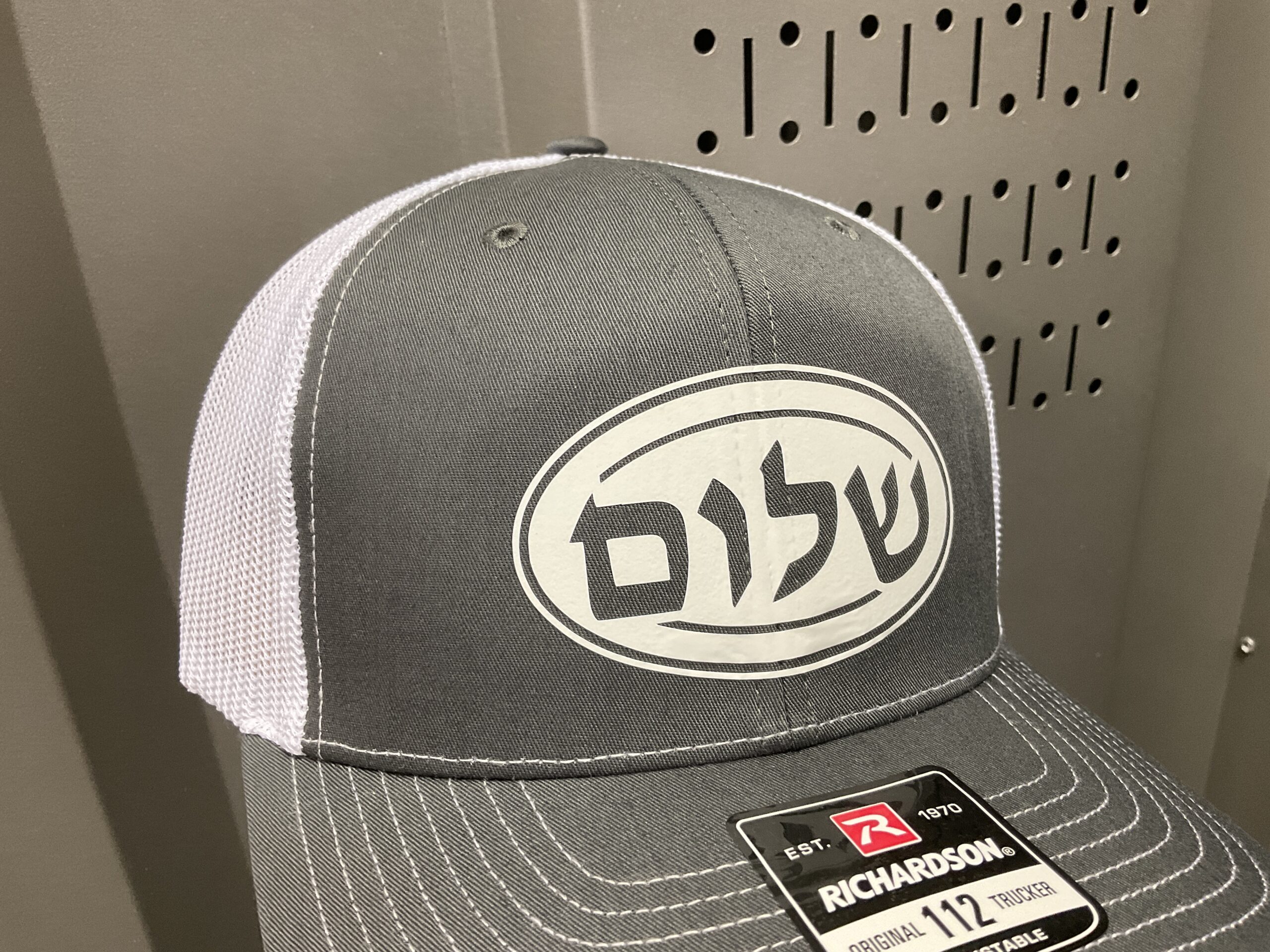 This design features the word ‘Shalom’, or ‘Peace’, written in Hebrew. With this snapback cap, peace will always be upon your head. This design is printed on a Richardson Trucker Cap.