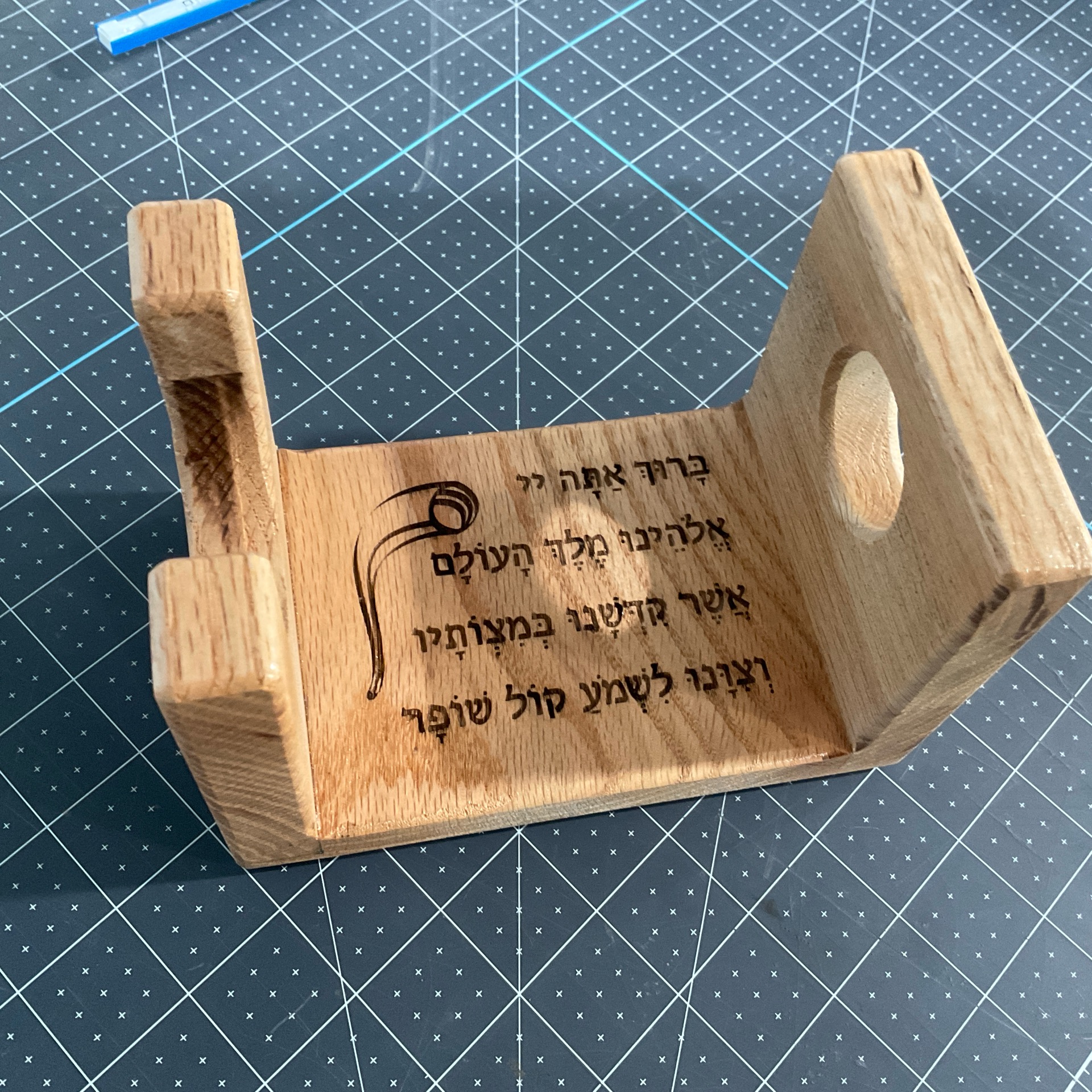 This is a holder for your shofar that includes the shofar blessing engraved in Hebrew and a small shofar design.